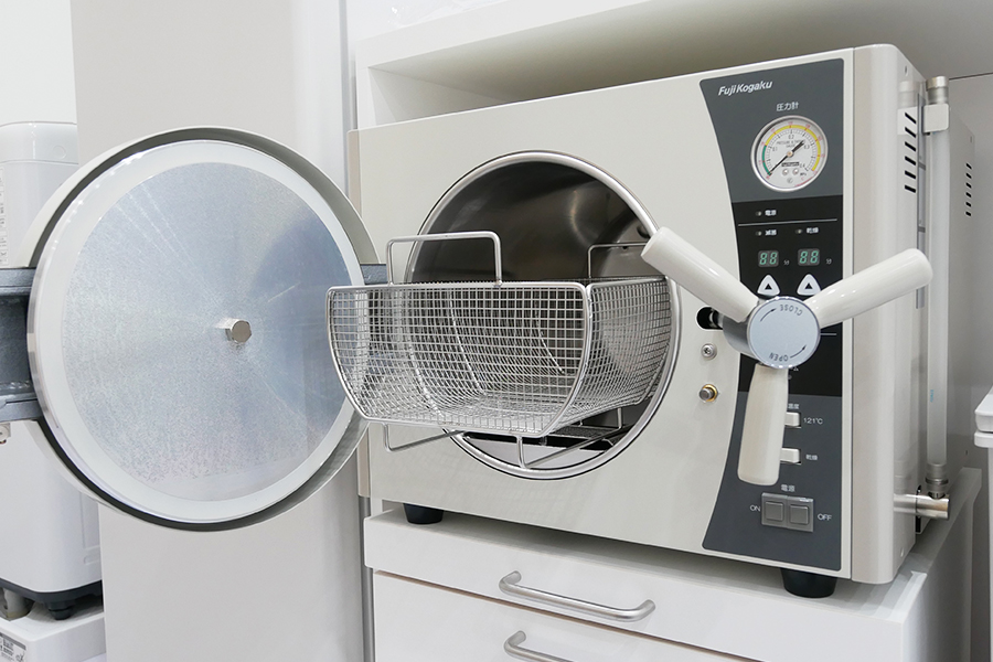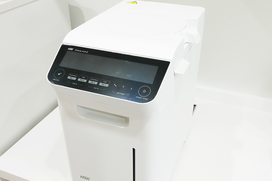 タービン(歯を削る器具)は内部構造が精密なため、通常の滅菌器では滅菌ができず、専用の滅菌器が必要です。当院ではタービンを使い回すことなく、患者さんごとに取り換えております。