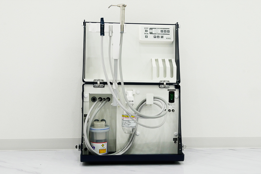 ポータブルユニットを備え、院外でも歯科診療が行える体制を整えています。電源や給水設備が限られる環境でも使用でき、診療内容に応じた対応が可能です。患者さんの体調や周囲の状況に配慮しながら、できる限り負担の少ない診療を行うために活用しています。